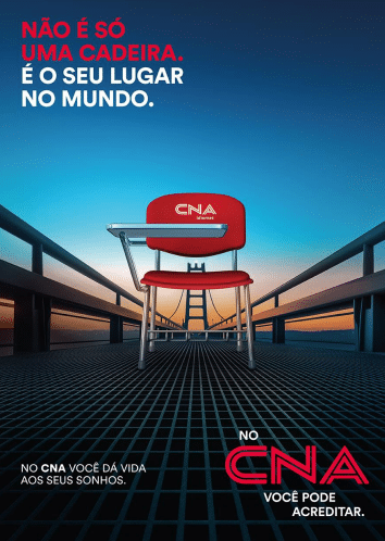 As peças, direcionadas para diversos perfis – desde o público infantil até o adulto – e com versões regionalizadas, trazem sempre em destaque a frase “Não é só uma cadeira”, retratando diferentes lugares, situações e sonhos que os estudantes podem conquistar aprendendo um segundo idioma. Em uma delas, a imagem mostra a cadeira na Golden Gate Bridge, em San Francisco, uma das pontes mais famosas dos Estados Unidos e do mundo. Outra peça traz a frase “Não é só uma cadeira, é se divertir enquanto aprende”, em alusão à parceria com a Disney – o CNA é a única rede de ensino de idiomas licenciada pela Disney na América Latina.